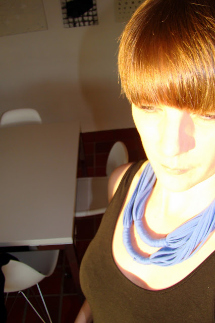 Endnu en idé fra Pinterest er dette halssmykke, som er lavet af en gammel t-shirt. Jeg er så glad for den og skal vist snart en tur i genbrug og forsyne mig med t-shirts.